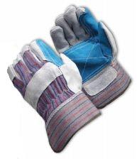 “B/C” grade split cowhide leather double palm glove, blue, black & red striped fabric back, cotton lined palm, rubberized safety cuff, wing thumb, brown cotton binding.
